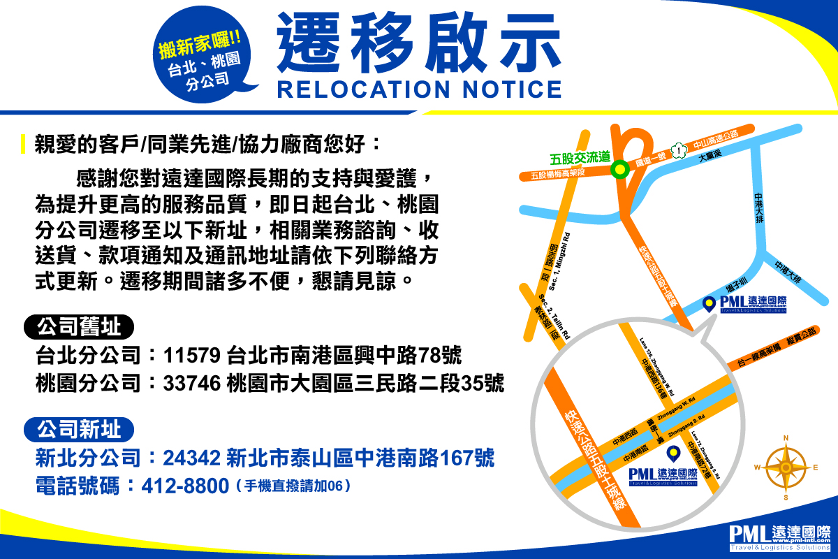 遷移通告,遠達國際台北及桃園分公司遷移通知